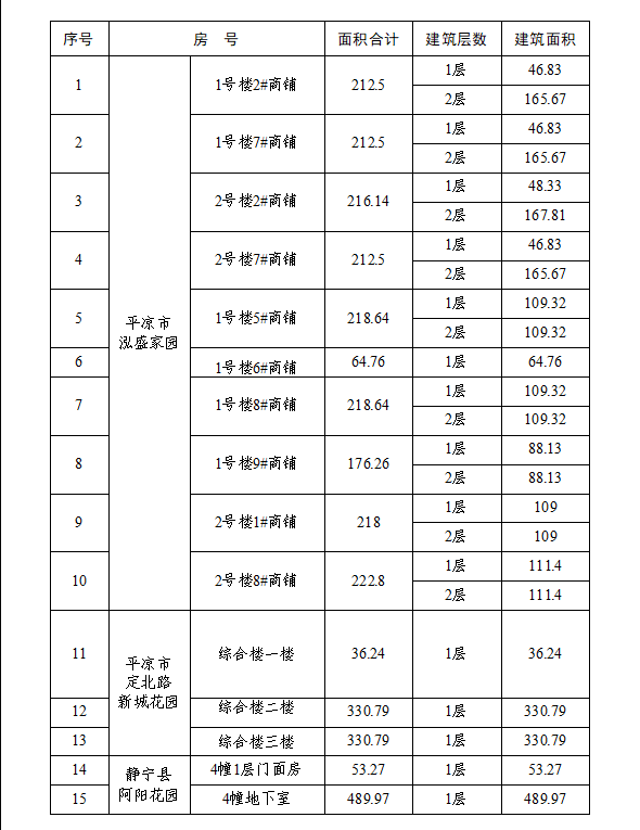 2020-12-15平凉泓源工业投资发展有限责任公司现有位于平凉市崆峒区十里铺泓盛家园的商铺、崆峒区定北路综合楼及静宁县阿阳花园地下室,现对外公开出租。具体情况公告如下∶一、出租房屋基本情况二、房屋出租期限及租金∶按上述房屋基本情况,房屋出租期限及租金面议。三、租赁合同
